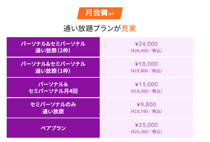 しっかり通いたい方は、パーソナル&セミパーソナル通い放題(2枠)やパーソナル&セミパーソナル通い放題(1枠)で毎日いくくらいのレベルでやるのが良いと思います。