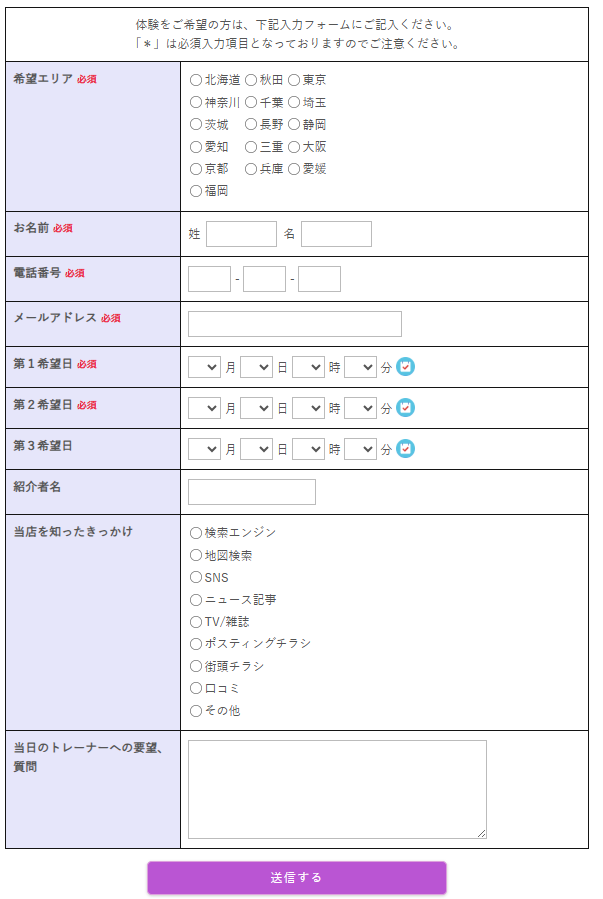 見学・体験時はをクリックして申し込みを行うと、以下のフォームが現れます。