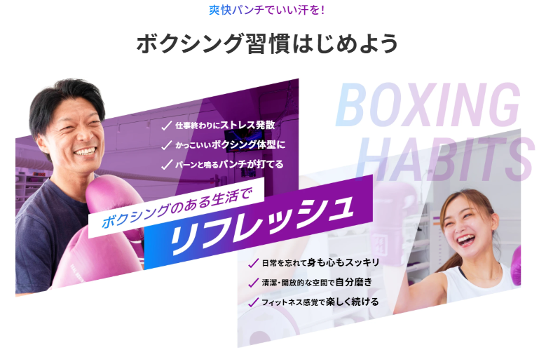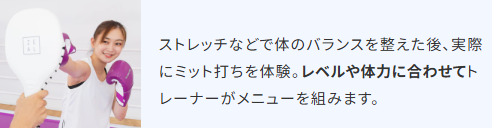ミットを叩く爽快感と、トレーナーの盛り上げにより、短時間で集中して運動できる点が高く評価されています。仕事のストレスを吹き飛ばしたいビジネス層に最適です。 - 「トレーナーがフレンドリーで、初心者でも怖くない」