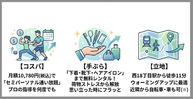 札幌市中央区や西18丁目駅周辺でジムを探している方、そして準備ゼロ・完全手ぶらで効率よく運動習慣を身につけたい方に必見の内容です。