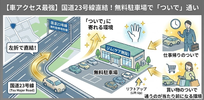 ①【車アクセス最強】国道23号線直結!無料駐車場で「ついで」通い