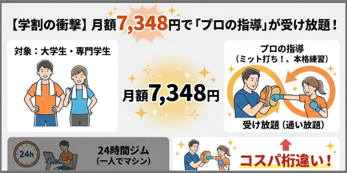 近隣の大学生・専門学生なら、地域最安級の価格で通い放題プランを利用可能。一人でマシンを使うだけの24時間ジムと違い、トレーナーがミットを持ってくれる本格的な練習ができるので、コスパの良さが桁違いです。