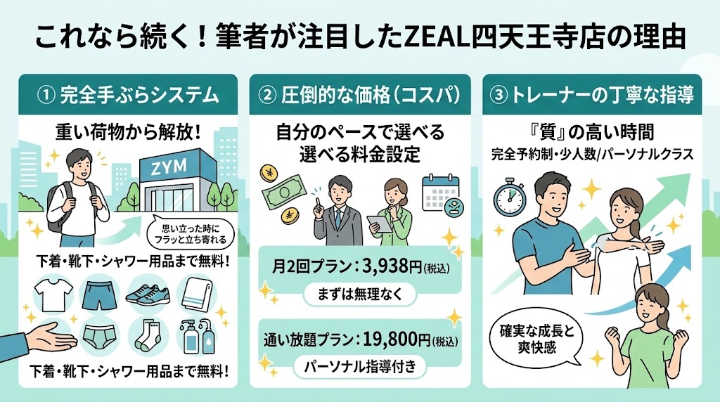 | ZEAL 四天王寺店 | ◎ 極めて高い(手ぶら+指導) | 下着・シャワー用品まで無料で手ぶらレベル最強。丁寧な指導付きで迷わず、モチベーションが続く。圧倒的なコスパ。 |